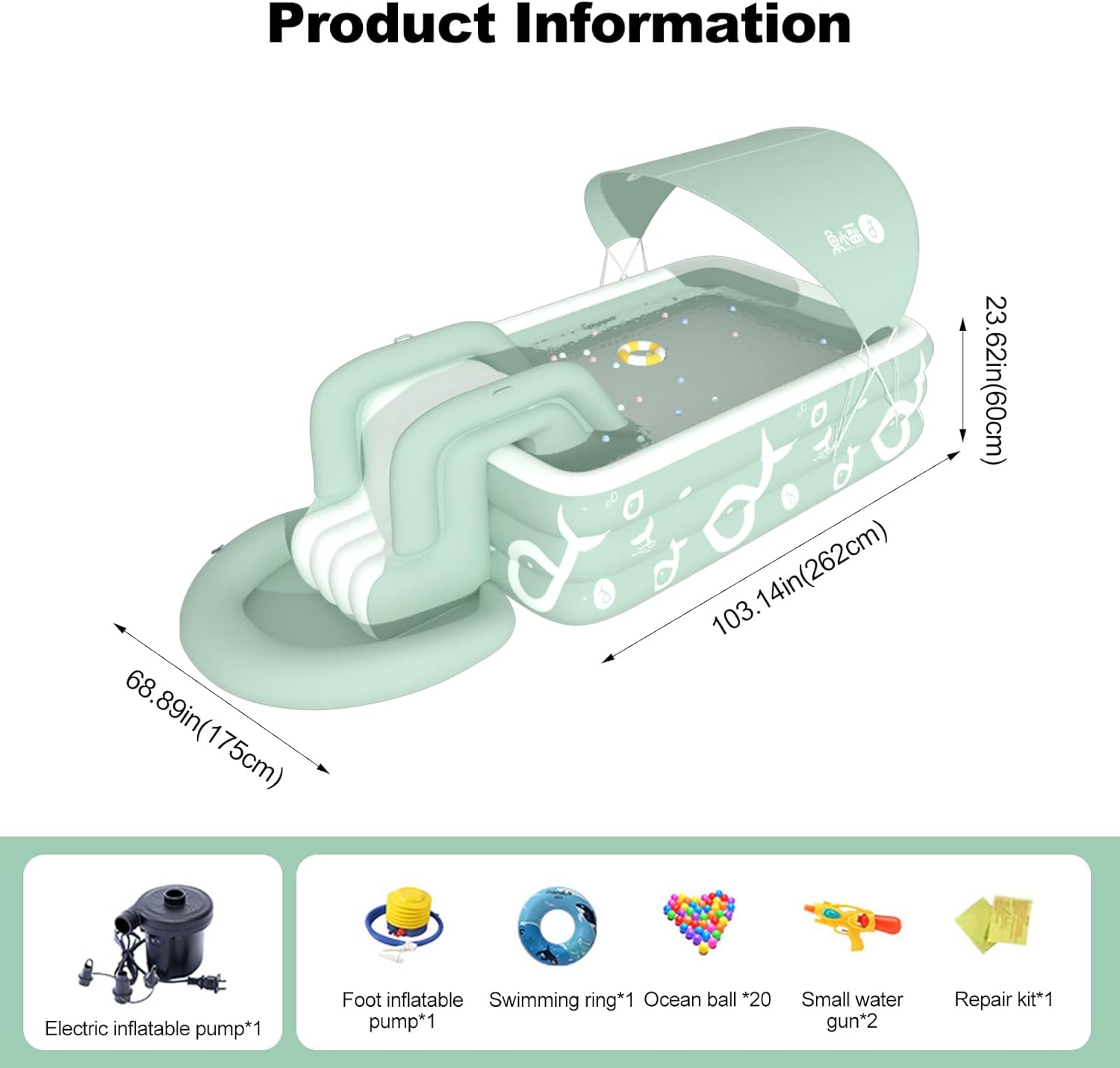 Acerca de este producto 【Tenda parasole】 Non preoccuparti di abbronzarti durante le calde giornate estive! È perfetto per sfuggire al caldo e godersi un po’ di tempo in famiglia. 【Scivolo integrato】 Porta gioia ai bambini e il massimo comfort. Una piscina di buone dimensioni per rinfrescarsi nelle calde giornate estive! Lo scivolo integrato rende il gioco dei bambini più piacevole. 【Materiale durevole】 Realizzato in robusto materiale addensato per resistere al gioco attivo in famiglia! Le robuste pareti gonfiabili garantiscono stabilità e forniscono ulteriore elasticità per creare i migliori ricordi per la tua famiglia. 【Facile da usare】 Facile da usare e veloce da riporre! Basta utilizzare la valvola di scarico facile da usare per rilasciare l’acqua della piscina. Deposito di deflazione per risparmiare spazio. 【Il nostro servizio】 forniamo una risposta rapida 24 ore su 24 e un servizio clienti amichevole a vita. Se sei soddisfatto dei nostri prodotti, lascia un commento e un feedback, ti ringrazieremo per il tuo incoraggiamento.
