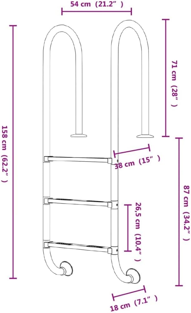 Escalera para Piscina de Acero Inoxidable: Esta escalera de piscina aporta calidad y solidez, y permite que los bañistas entren y salgan de la piscina con facilidad. Material duradero: Esta escalera para piscina está hecha de acero inoxidable 304, que es resistente y duradero para usar a largo plazo. También tiene buena resistencia a la corrosión y al óxido. Alta seguridad: La conexión maciza entre cada pieza mejora la rigidez general de la escalera de piscina, y ofrece un fuerte soporte cuando se usa. Esta escalera de piscina ha sido diseñada para no resbalar. Cuenta con peldaños antideslizantes, que mejoran la seguridad general al entrar o salir de la piscina Diseño curvo: El pasamanos de la piscina tiene un diseño curvo que se adapta a la forma de las manos para facilitar el agarre. Amplios usos: La escalera para piscina es una opción perfecta para diversos lugares como piscinas, entradas inclinadas, spas, parques acuáticos, etc.