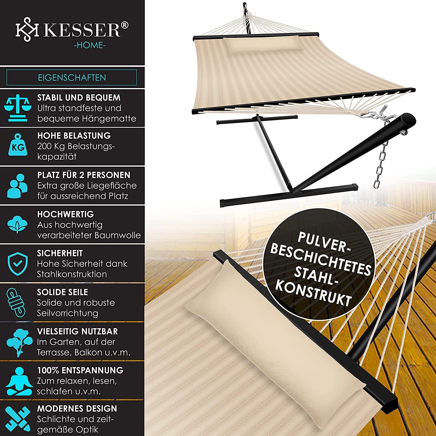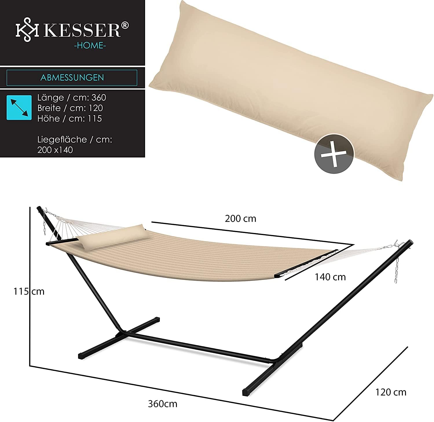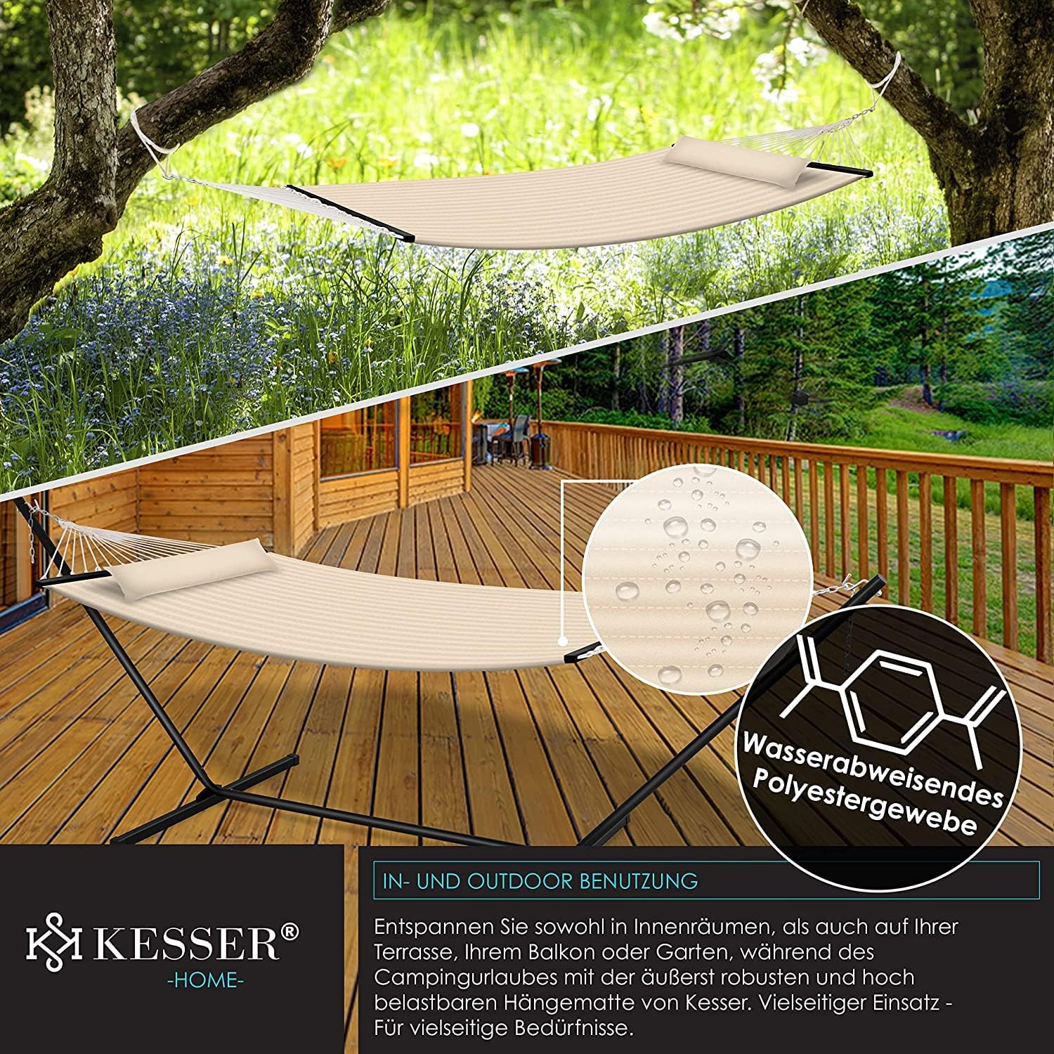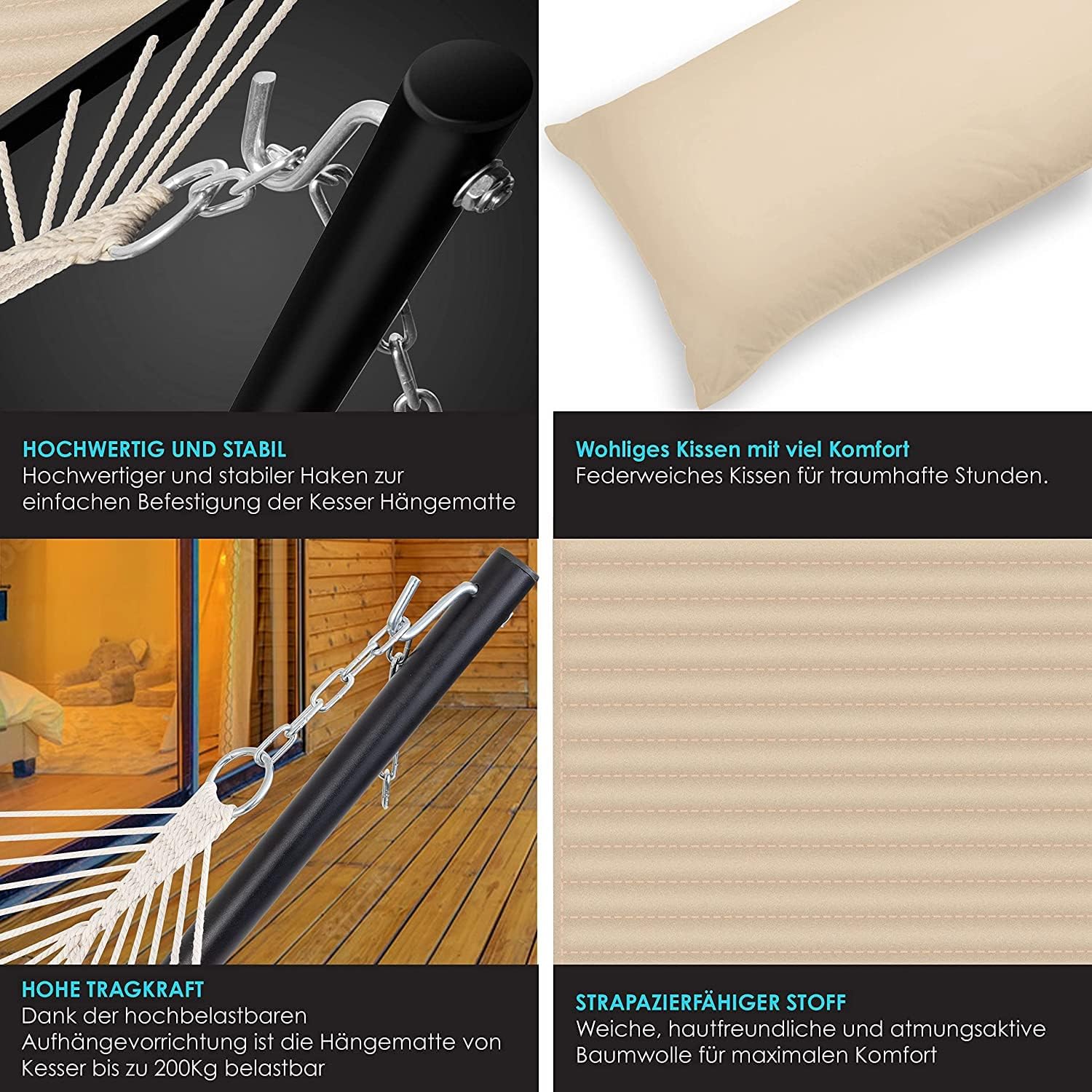 Adapte la robusta hamaca de KESSER de forma rápida y sencilla a sus necesidades y disfrute de la máxima comodidad y flexibilidad en su balcón o jardín. Gracias a la superficie de descanso alta y cómoda, aquí hasta dos personas encuentran suficiente espacio para disfrutar del momento. La almohada incluida te garantiza un sueño relajante y acogedor al aire libre.